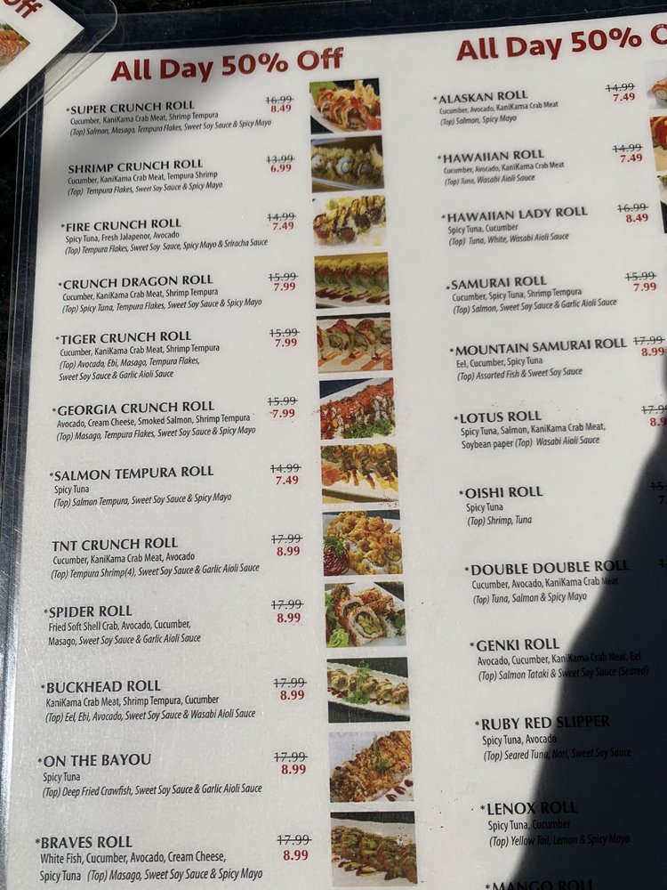 Cucumber, avocado, crab meat. (Top) Baked crawfish, masago, eel sauce & spicy mayo. These items may contain raw or undercooked ingredients